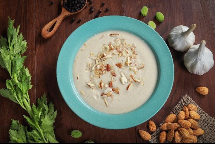4 कप के लिए – सामग्री:– 10 मि.ली. वेजिटेबल ऑयल, 5–6 लहसुन की कलियाँ, कटी हुई, 45 ग्राम प्याज़, कटा हुआ, 20 ग्राम लीक्स, कटा हुआ, 10 ग्राम सेलरी, 200 ग्राम फूलगोभी, 1/4 कप दूध, 50 ग्राम बादाम, 100 मि.ली. वेजिटेबल स्टॉक, 20 ग्राम परमेज़न चीज़, घिसा हुआ, स्वादानुसार नमक, स्वादानुसार कुटी काली मिर्च।
